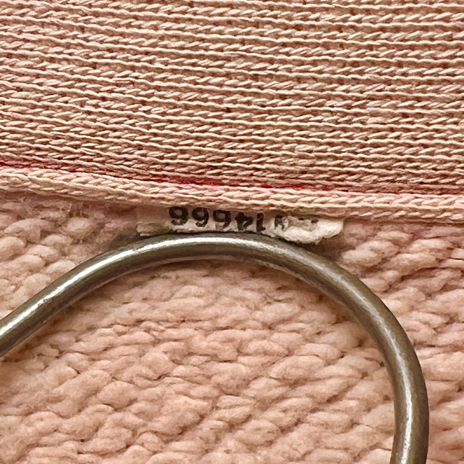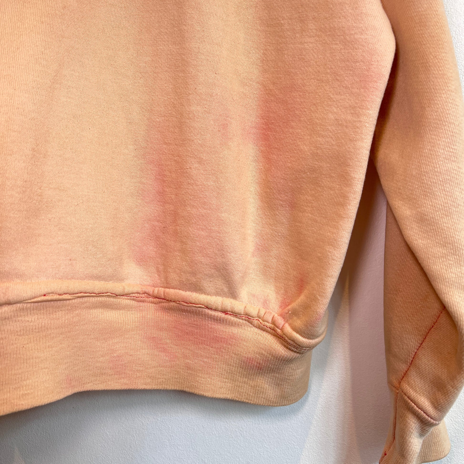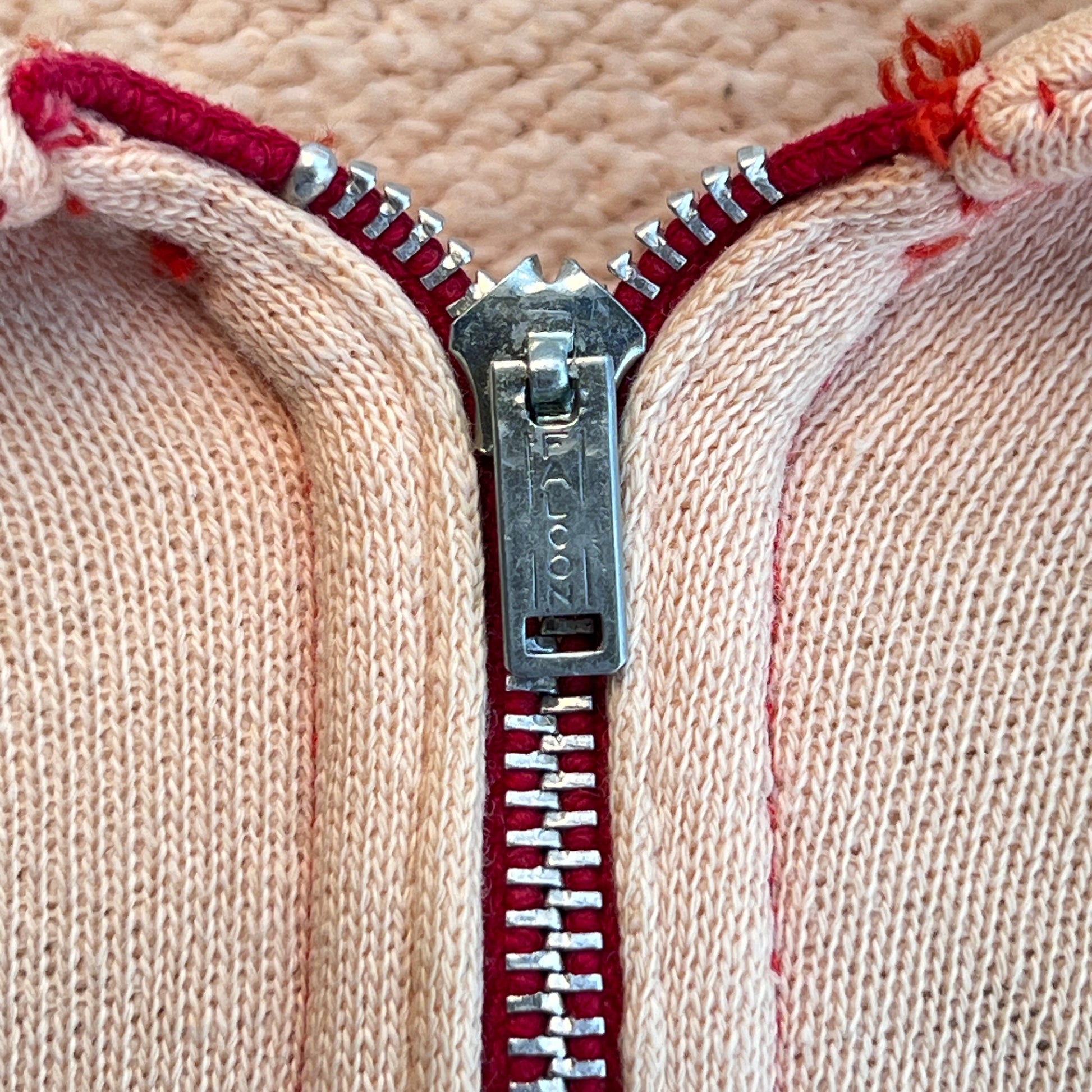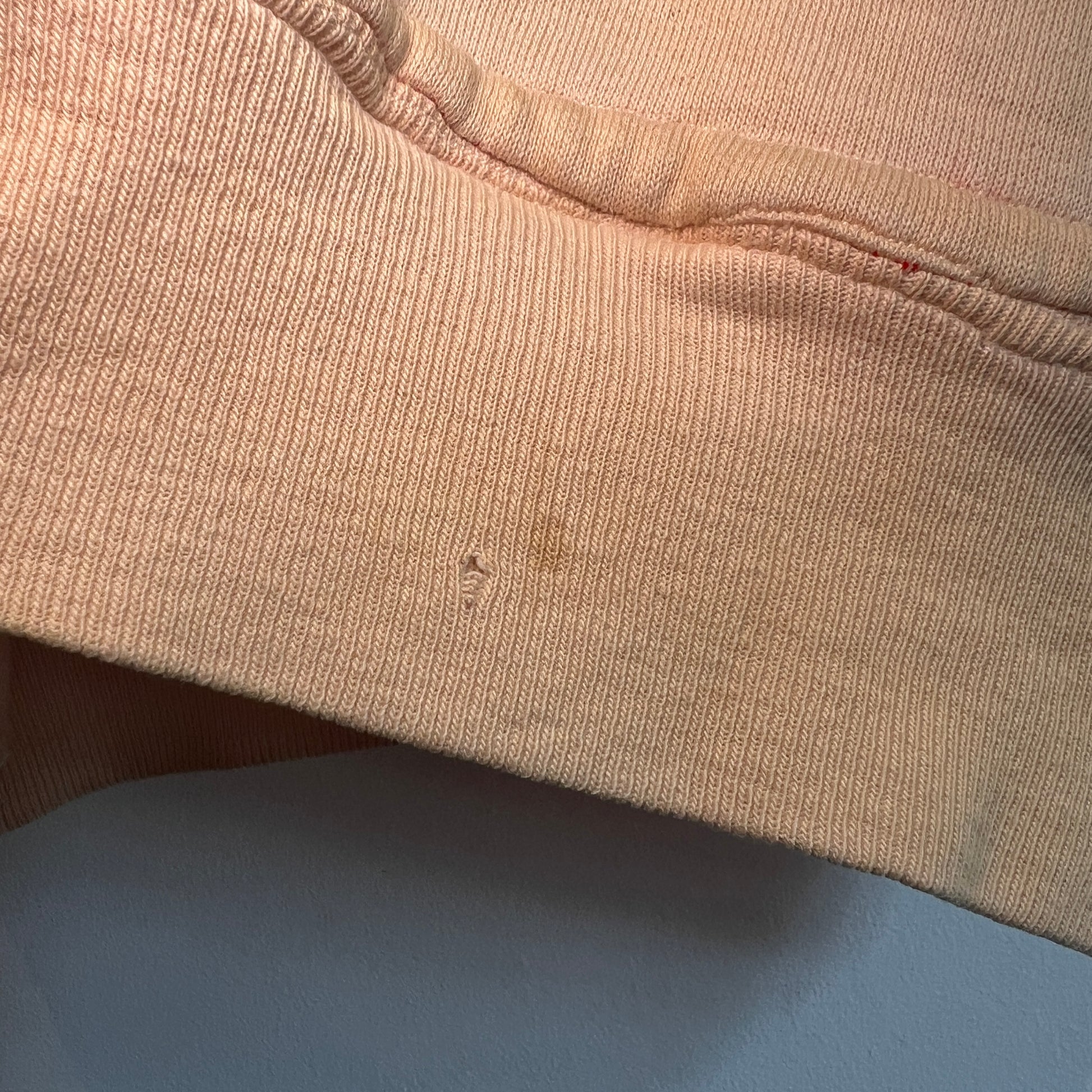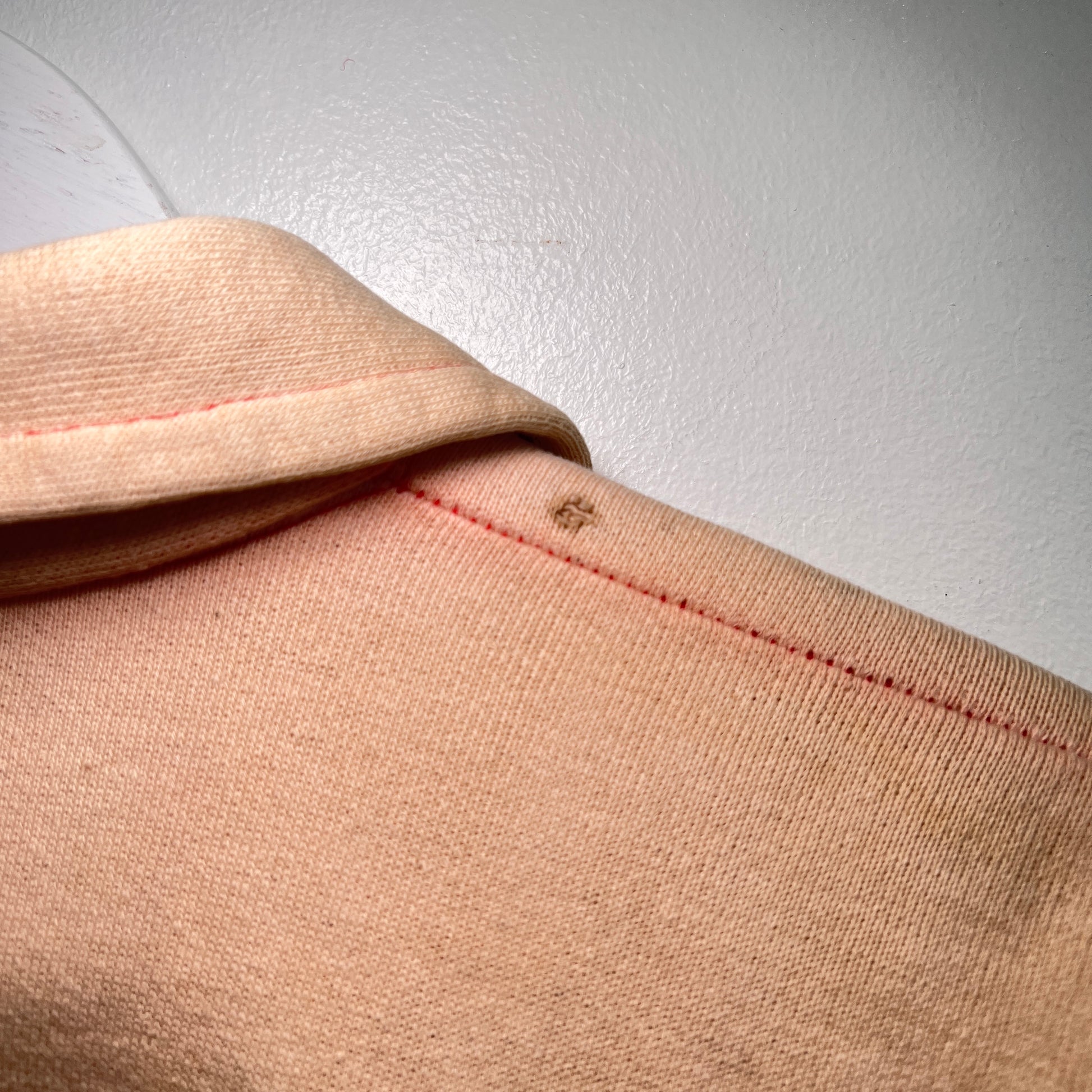 color: faded salmon pink and red stitch